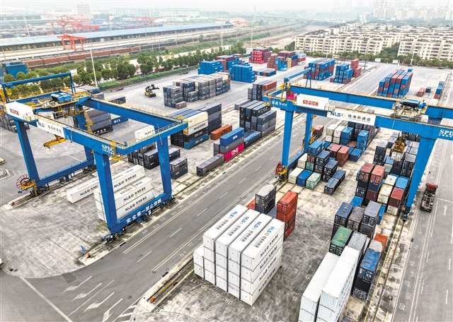 12月8日,位于沙坪壩區(qū)的陸海新通道重慶無水港內(nèi),來自全球的集裝箱正在裝車。 國鐵集團(tuán)數(shù)據(jù)顯示,從2017年開行以來,截至今年11月30日,西部陸海新通道班列已累計發(fā)送集裝箱貨物超500萬標(biāo)箱,僅今年1—11月發(fā)送量就超130萬標(biāo)箱。…