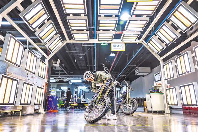 12月9日,大渡口區(qū)虬龍科技車間,工人正在檢測剛下線的摩托車。 今年,虬龍科技電動越野摩托產(chǎn)能達(dá)4.5萬臺,海外出口占比50%、覆蓋近50個國家?!?/p>