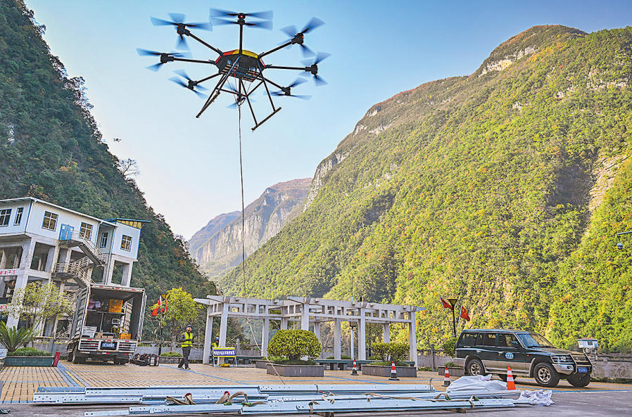 重慶首次應(yīng)用重載無(wú)人機(jī)山地運(yùn)輸電力塔材