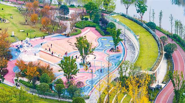 11月26日,大渡口區(qū)心湖公園,彩林與湖泊相映成趣,不少市民在湖邊散步、休閑。近日,各地色彩斑斕的樹木將山城裝扮得美麗如畫?!?/p>