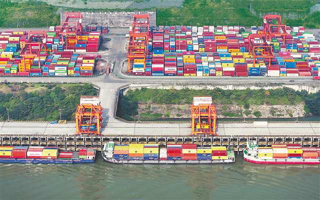 11月24日,重慶果園港,多艘貨船??吭诟劭谘b卸集裝箱(無人機照片)。 近年來,重慶積極開辟水鐵聯運、水公聯運等多式聯運,素有“黃金水道”之稱的長江航運持續(xù)運輸繁忙?!?/p>