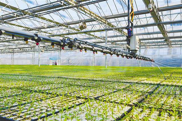 11月25日,北碚區(qū)興隆鎮(zhèn)嘉禾智慧種苗工廠內,自動噴淋系統(tǒng)正在為種苗精準灌溉。這座“植物工廠”運用人工智能技術,實現了從基質處理、高速播種到環(huán)境調控等方面的全流程自動化?!?/p>