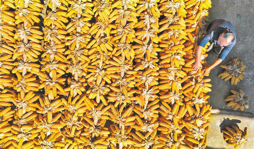 10月11日,黔江區(qū)濯水鎮(zhèn)五福村,村民在晾曬玉米(無人機(jī)照片)。 晚秋時節(jié),黔江區(qū)高海拔山村的水稻、玉米、辣椒等農(nóng)作物成熟,農(nóng)民們抓住晴好天氣搶收搶曬,讓顆粒歸倉,實現(xiàn)增收?!?/p>