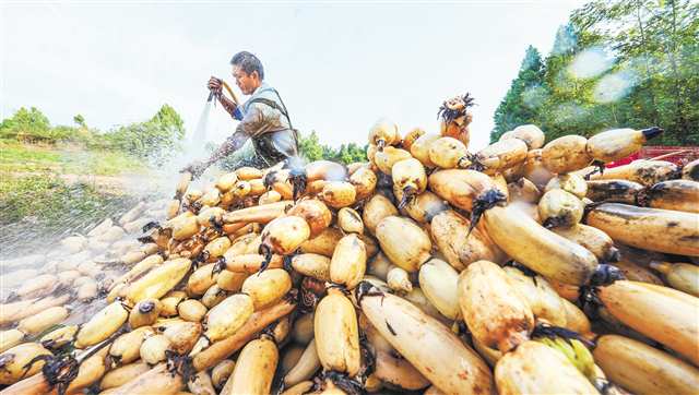 10月11日,墊江縣硯臺鎮(zhèn)農(nóng)光村蓮藕基地,工人正在沖洗剛采收的蓮藕。 近年來,硯臺鎮(zhèn)以產(chǎn)業(yè)振興為抓手,引入種植大戶發(fā)展蓮藕2000余畝,并建立起蓮藕加工廠和觀賞荷花基地,形成夏賞荷花秋收蓮藕的循環(huán)發(fā)展模式?!?/p>