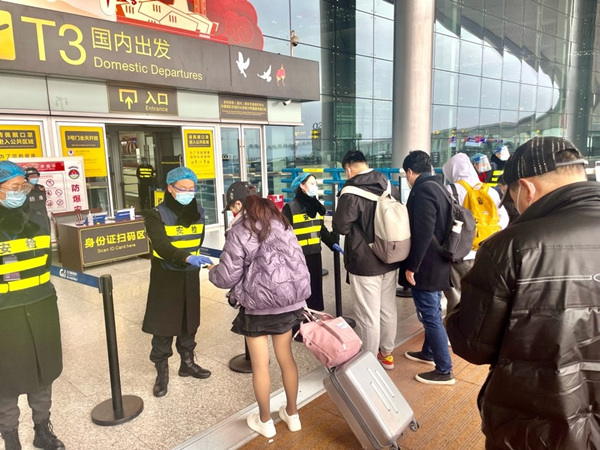 “請出示您的健康碼和行程碼。”1月27日,重慶江北國際機場T3航站樓出發(fā)3號門處,機場安檢站特勤部工作人員呂萬強和同事們一字排開,守護著航站樓出發(fā)大廳疫情防控第一道“關(guān)口”——查驗每一位進入航站樓人員的健康碼和行程碼。