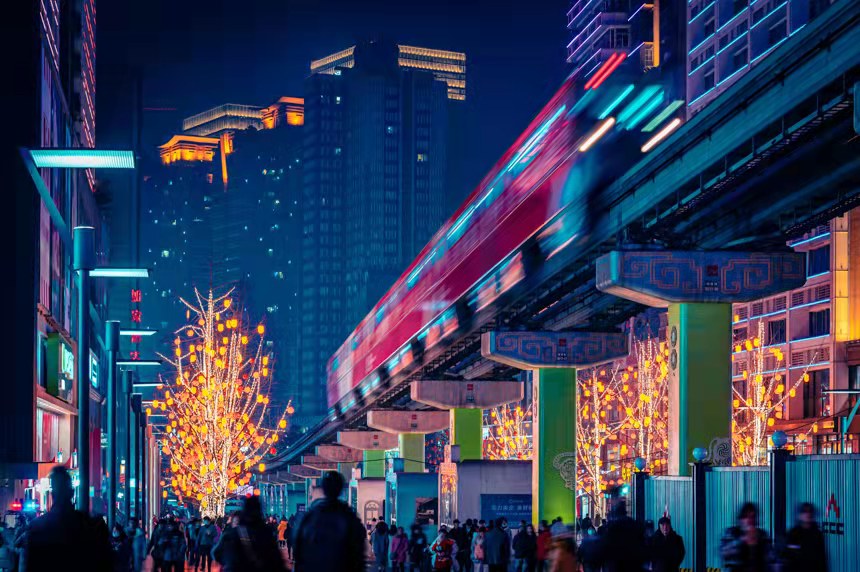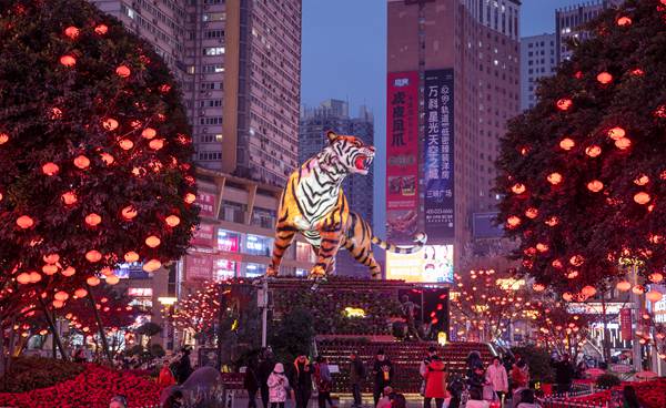 南岸區(qū)南濱路,“虎年大吉”工藝燈組栩栩如生,預(yù)示著虎虎生威,絢麗多彩;九龍坡區(qū)楊家坪商圈的行道樹上,掛滿新春福牌,隨風(fēng)搖擺格外耀眼;沙坪壩區(qū)三峽廣場,流水浮燈,浪漫依然;江北區(qū)觀音橋商圈,剛剛亮相的6只大型老虎燈飾,向市民們傳遞著新年的祝福,六只“萌虎”憨態(tài)可掬,濃濃“年味兒”讓人倍感年味、溫情。