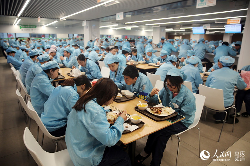 春節(jié)假期過后,重慶市企業(yè)陸續(xù)復(fù)工復(fù)產(chǎn),生產(chǎn)車間一派繁忙景象。臨近中午,走進位于重慶渝北區(qū)的OPPO(重慶)智能科技有限公司,只見工廠食堂內(nèi)座無虛席,身著藍色工裝的工人們正在統(tǒng)一用餐,場面熱鬧非凡。