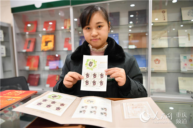 南坪郵政大廳內(nèi)工作人員展示庚子年生肖鼠郵票 郭旭 攝