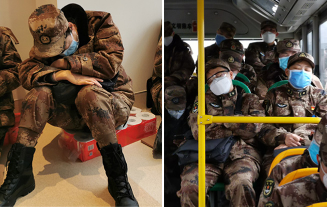 穿上笨拙的防護服,他們不分晝夜竭力救治,只有從駐地到醫(yī)院的公交車上可以短暫休息。