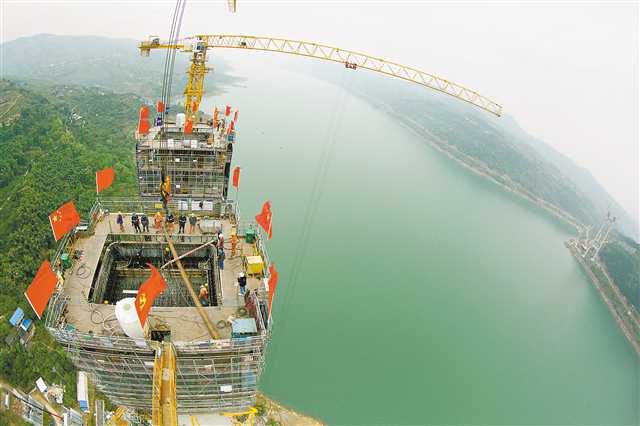 4月2日,萬(wàn)州新田長(zhǎng)江大橋主塔順利封頂。(中交一公局集團(tuán)萬(wàn)州環(huán)線高速項(xiàng)目部供圖)