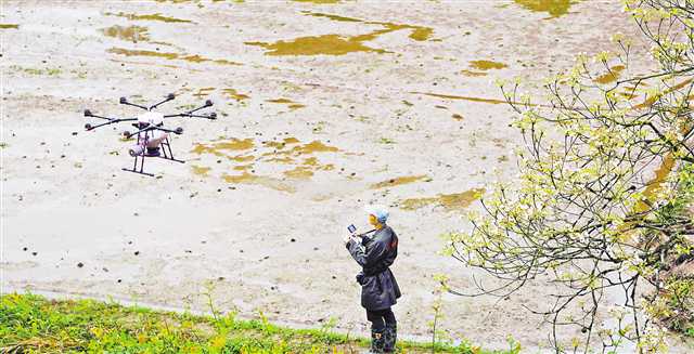 4月1日,梁平區(qū)碧山鎮(zhèn)川主村四組,工作人員操作無人機(jī)在平整好的田塊上進(jìn)行水稻播種。這種無人機(jī)每小時(shí)可以播種50余畝稻田,大大提高了播種效率。