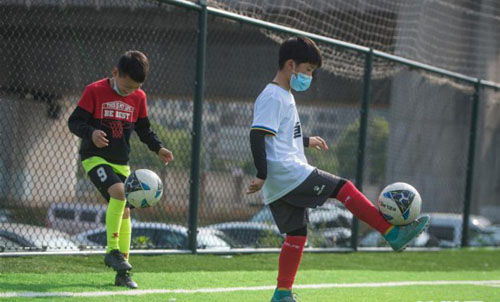4月19日,小朋友在武漢百駿體育公園足球場上踢球。 武漢百駿體育公園于4月8日獲批復(fù)工營業(yè)。足球愛好者們重返綠茵場,享受運(yùn)動的快樂。 新華社記者肖藝九攝