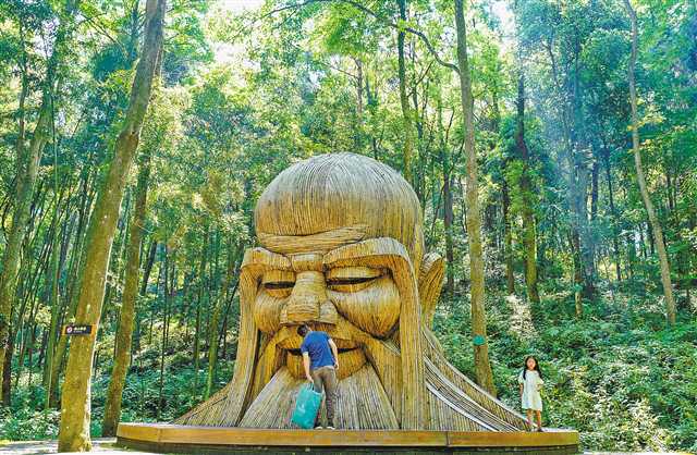 5月3日,在百里竹海景區(qū),游客在壽竹制成的壽星塑像前游玩。 新華社記者 劉潺 攝