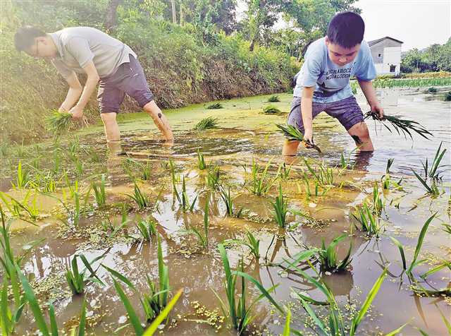 5月4日,綦江區(qū)永城鎮(zhèn)大橋村,來自城里的小朋友在家長帶領(lǐng)下學(xué)習(xí)插秧。通訊員 夏昌銘 攝