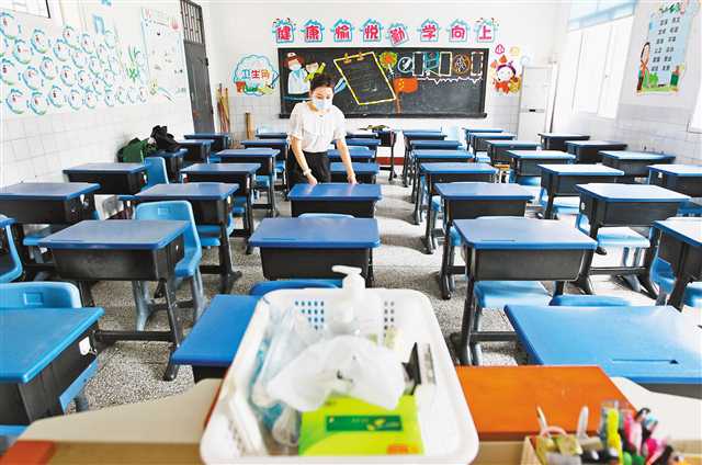 5月6日,江北區(qū)鯉魚池小學(xué),老師在教室內(nèi)移動課桌,以確保間距符合防疫標(biāo)準(zhǔn)。記者 盧越 攝