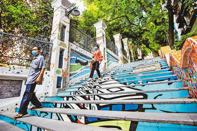 5月9日,渝中區(qū)棗子嵐埡街道,市民行走在時光里·棗子嵐埡步道上。位于人民大禮堂北部的時光里·棗子嵐埡步道,連接著棗子嵐埡正街與中山二路。步道階梯由亮色瓷磚裝點,階梯的立面上涂繪了渝中區(qū)的熱門景點,步道旁修建了“文化墻”。美麗的步道增添了山城的顏值,提高了市民的生活品質(zhì)。