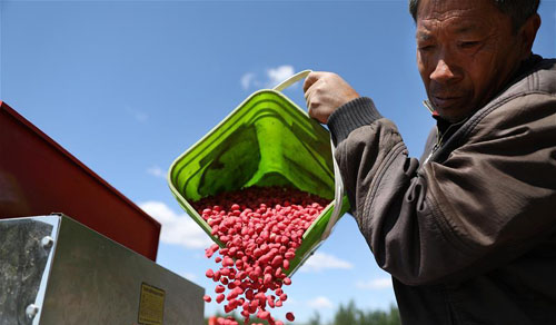 5月12日,臺(tái)安縣洪家農(nóng)牧場(chǎng)的一名工人往農(nóng)機(jī)里投放花生種子。 隨著氣溫升高及土壤墑情適宜,遼寧省鞍山市臺(tái)安縣搶抓農(nóng)時(shí)開始大面積播種花生,田間地頭一派繁忙景象。 新華社記者 姚劍鋒 攝