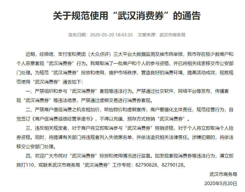 5月20日,武漢市商務(wù)局發(fā)布通告,嚴(yán)禁組織和參與“武漢消費(fèi)券”套現(xiàn)等違法行為,違反相關(guān)規(guī)定者,對(duì)于商戶將立即取消參與“武漢消費(fèi)券”核銷資格,對(duì)于個(gè)人將立即取消個(gè)人搶券資格。同時(shí),將提請(qǐng)有關(guān)部門將違規(guī)者列入失信黑名單,并依法追究相關(guān)法律責(zé)任。涉嫌犯罪的,將依法移交公安部門處理。