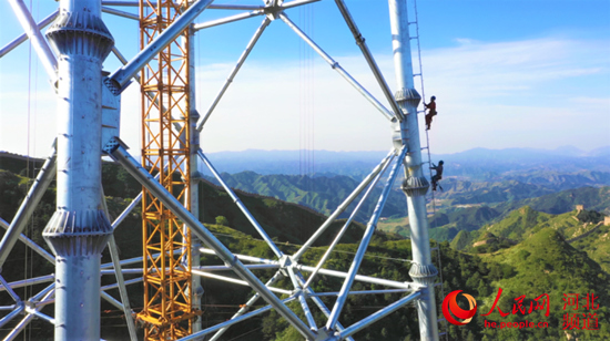 6月4日上午12時許,河北省保定市白石山烏龍溝長城西側(cè),張北至雄安1000千伏特高壓交流輸變電工程線路工程(河北段)4S004組塔現(xiàn)場,隨著右側(cè)地線支架吊裝就位,標(biāo)志著4S004鐵塔組立完成。