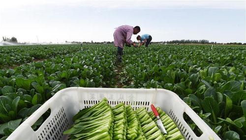 6月8日,粵港澳大灣區(qū)“菜籃子”(金昌)生產(chǎn)基地工作人員在采摘蔬菜。 盛夏漸近,位于甘肅省金昌市金川區(qū)的粵港澳大灣區(qū)“菜籃子”(金昌)生產(chǎn)基地的多種蔬菜陸續(xù)豐收。該基地種植面積達1.3萬多畝,采用高效噴灌、精量播種等技術(shù),以及“企業(yè)+合作社+基地+農(nóng)戶”的模式,通過輪作倒茬、循環(huán)供應(yīng)的方式,每年可種植蔬菜3至4茬,畝均產(chǎn)量2000公斤左右,總產(chǎn)值達1.5億元。 新華社記者 范培珅 攝