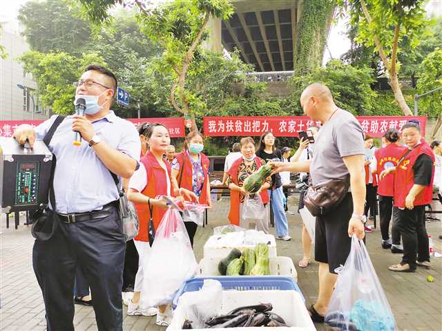 “農(nóng)家土貨來趕集,請為扶貧出把力!敝抑萁值厘\鴻社區(qū)的“愛心集市”設(shè)在長江大橋下。來自石寶鎮(zhèn)太平村的黨支部書記袁亮身挎音響、手拿話筒,正賣力吆喝:“買茄子南瓜嘍!貧困村貨真價實的農(nóng)產(chǎn)品!”