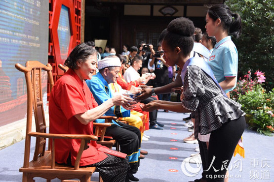 在今天活動現場,舉行了老外@Chongqing·體驗非遺拜師儀式,喻良華、唐佑倫等非遺傳承人集體登臺,接受來自俄羅斯、赤道幾內亞、盧旺達、貝寧等多個國家“非遺”學徒代表遞上的“拜師帖”,并喝下拜師茶,正式收下2020年“老外@Chongqing·體驗非遺”活動中的首批徒弟。