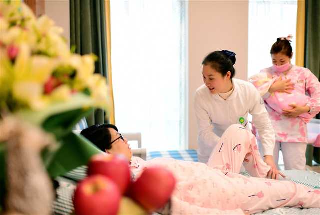 重慶市璧山區(qū)人民醫(yī)院婦產(chǎn)科病房內(nèi),護(hù)士正在為產(chǎn)婦做產(chǎn)后護(hù)理。攝/胡悅建