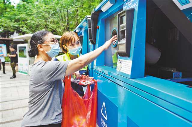 8∶58 分類投放。7月3日,鋼球小區(qū)居民婁碧華(左)把塑料瓶放入可回收物智能投放箱。記者 郭曉靜 崔曜 攝/視覺重慶