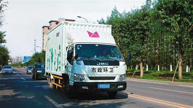 11∶47 回收轉(zhuǎn)運。收運車離開鋼球小區(qū),返回陳庹路中轉(zhuǎn)站分選中心。(市環(huán)衛(wèi)集團供圖)