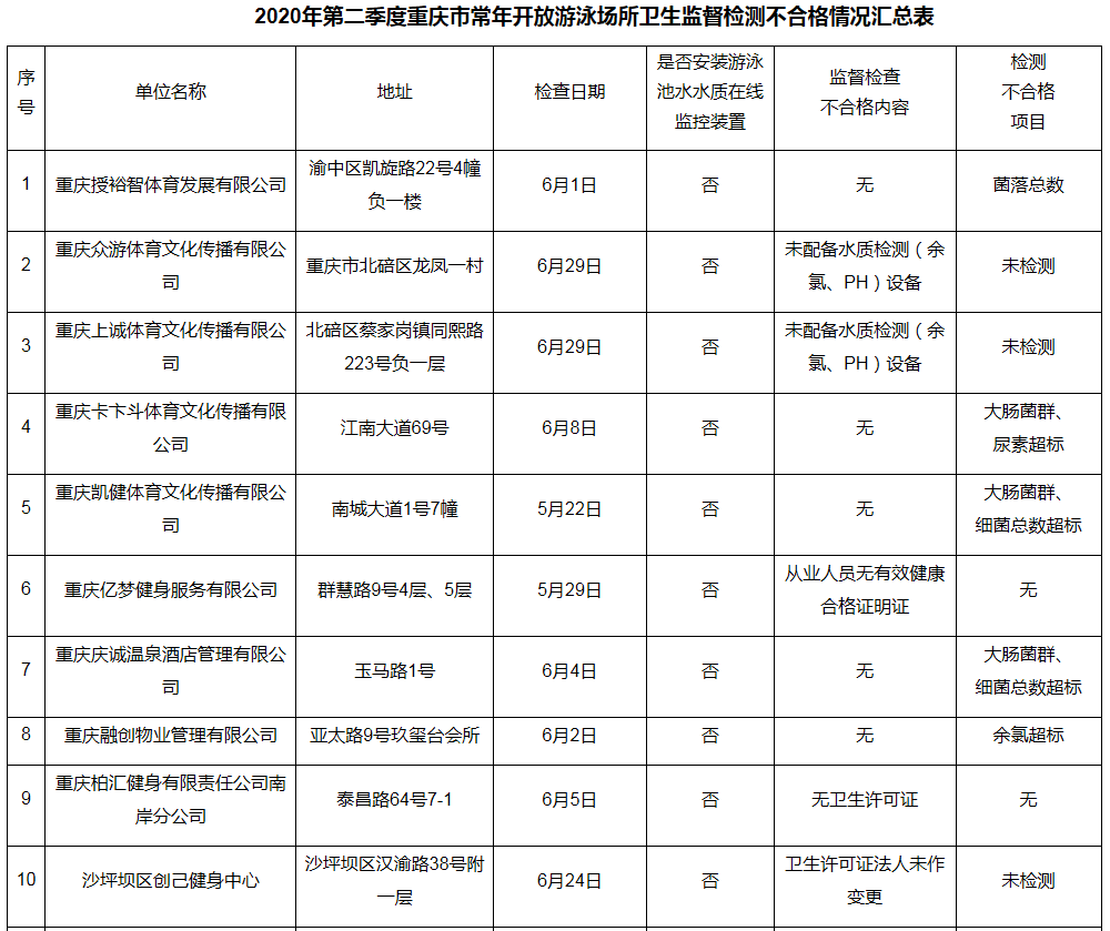 人民網(wǎng)重慶7月22日電(陳琦)隨著天氣逐漸升溫,到游泳館健身鍛煉的人越來(lái)越多。大家對(duì)游泳場(chǎng)館的水質(zhì)放心嗎?今日,重慶市衛(wèi)生健康委公布2020年第二季度全市不合格游泳場(chǎng)所監(jiān)督檢查匯總名單。結(jié)果顯示,有25家游泳池不合格,大家快看看有沒(méi)有常去的游泳池。