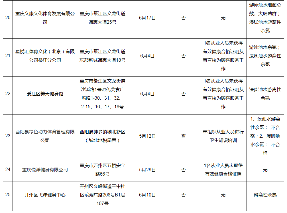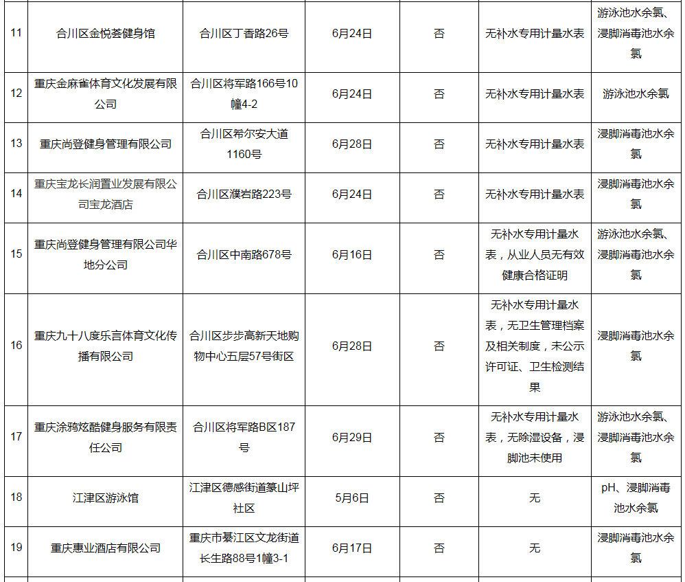 其中,位于渝中區(qū)凱旋路的重慶授裕智體育發(fā)展有限公司游泳池菌落總數(shù)檢測(cè)不合格;位于北碚區(qū)的重慶眾游體育文化傳播有限公司游泳池未配備水質(zhì)檢測(cè)(余氯、PH)設(shè)備。監(jiān)督檢查發(fā)現(xiàn),位于綦江區(qū)的美天健身館游泳池浸腳池水游離性余氯檢測(cè)不合格,且1名直接為顧客服務(wù)的從業(yè)人員未獲得有效健康合格證明。