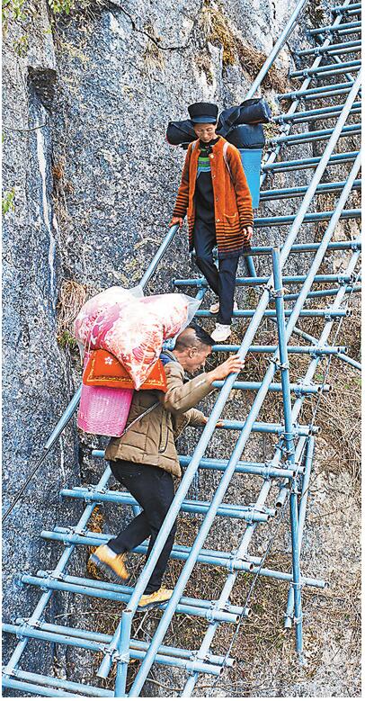 5月13日,某色達(dá)體夫婦背著東西沿著“懸崖村”的鋼梯下山,準(zhǔn)備搬進(jìn)昭覺縣城易地扶貧搬遷安置點(diǎn)的新家。