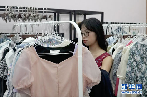 永川區(qū)聚麗電子商務有限公司的工作人員在整理設計的女裝產(chǎn)品。新華網(wǎng) 耿駿宇 攝