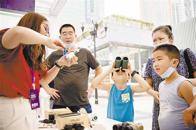 七月二十五日,解放碑步行街,“外貿優(yōu)品匯 扮靚步行街”活動現(xiàn)場,市民帶著孩子體驗商家展出的望遠鏡。記者 謝智強 攝\視覺重慶