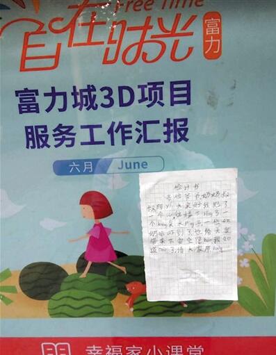 “各位爺爺、奶奶、叔叔、阿yi大家好,我犯了一個(gè)cuo!边@幾天,高新區(qū)一小區(qū)的告示欄里,貼出了一個(gè)孩子的檢討書,檢討書里還有不少拼音,孩子寫道:“我往樓下reng了個(gè)kuang泉水ping子,一位奶奶bei嚇到了……”