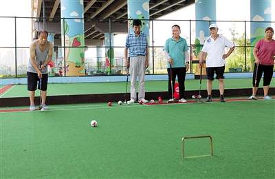 老人們在接龍橋社區(qū)體育文化公園里打門球。