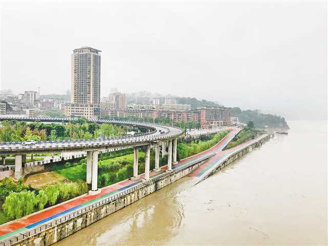 8月13日9時(shí),嘉陵江上漲的江水已經(jīng)將正碼頭廣場步道部分淹沒。通訊員 劉洪滔 攝/視覺重慶