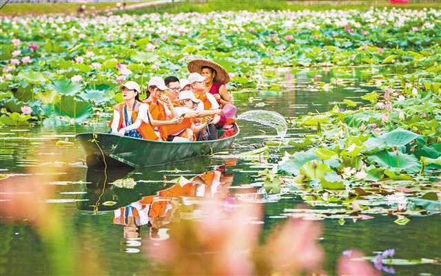 8月13日,武隆區(qū)滄溝鄉(xiāng)大田濕地人家鄉(xiāng)村旅游點(diǎn),游客泛舟荷塘。該景區(qū)以“荷”為主題,是一處集觀光、休閑、度假、體驗(yàn)于一體的綜合性旅游景區(qū)。