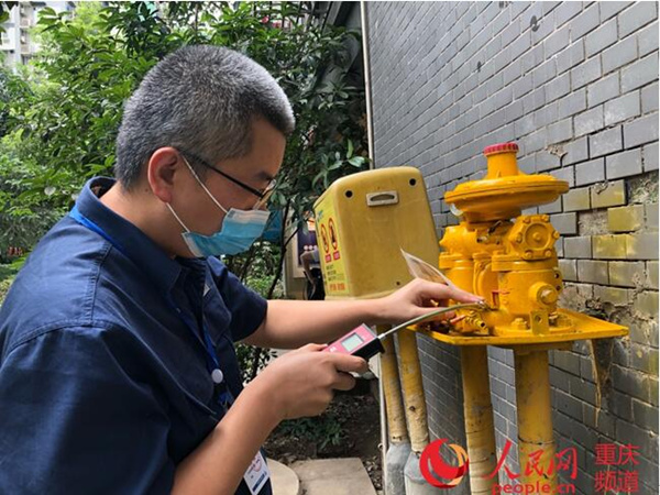 燃?xì)夤竟ぷ魅藛T對渝中區(qū)化龍橋臨江佳園小區(qū)燃?xì)夤艿篱_展檢測。劉敏攝