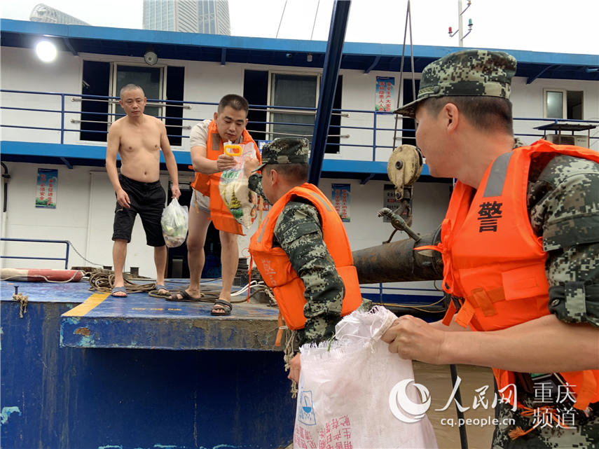 “水廠有8名工人被困!”20日清晨6點40分許,接南岸區(qū)指揮部通報,涂山自來水廠取水躉船有工人被困50多個小時,在涂山街道全時值守的船艇支隊官兵第一時間駕駛沖鋒舟,裝載礦泉水、食用油、面包、大米、蔬菜等救援物資前往救援。由于洪水漫灌南濱路,道路交通設(shè)施遍布,水上水下水情復(fù)雜、水流湍急,武警官兵克服重重困難,才將食材和飲用水供給上躉船,成功轉(zhuǎn)移7名被困人員。