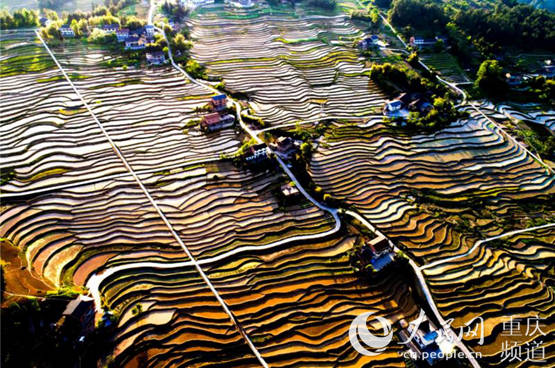 人民網(wǎng)重慶8月24日電 南川區(qū)石溪鎮(zhèn)鹽井梯田,稻穗沉甸,像座座金塔頂玉宇。4000余畝梯田集中連片,層層疊疊,形狀各異,在陽光下好似從人間登上天堂的天梯,此景恍如天上人間。