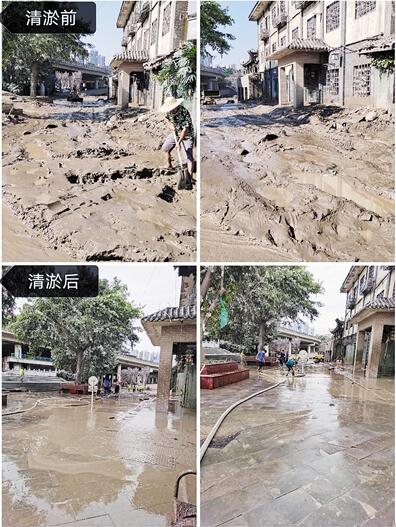 巨大的鏟車、高壓水龍頭、鐵鏟、掃帚、雙手……在這兩天的磁器口古鎮(zhèn)里,隨處可見的,是在淤泥里忙碌的人群。