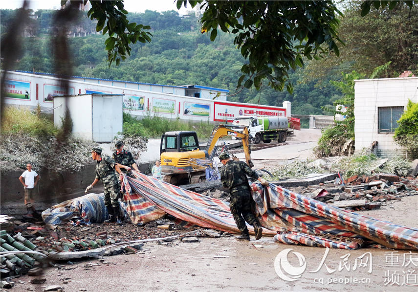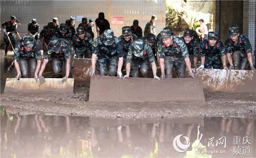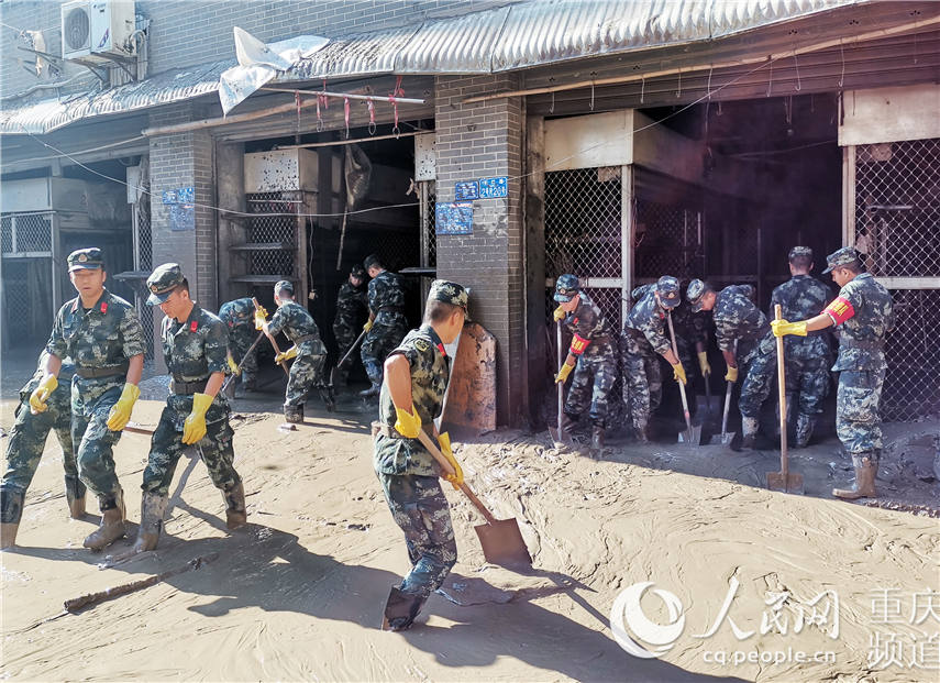 圖為武警重慶市總隊(duì)執(zhí)勤第一支隊(duì)勤務(wù)保障大隊(duì)官兵清淤現(xiàn)場(chǎng)。郭傳伍攝