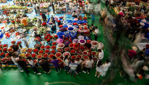 8月25日,市民在昆明斗南花市選購。 當(dāng)日是我國傳統(tǒng)節(jié)日七夕節(jié),云南省昆明市斗南花卉市場迎來鮮花交易高峰,大批鮮花集中上市,供應(yīng)節(jié)日市場。 新華社發(fā)(王冠森攝)