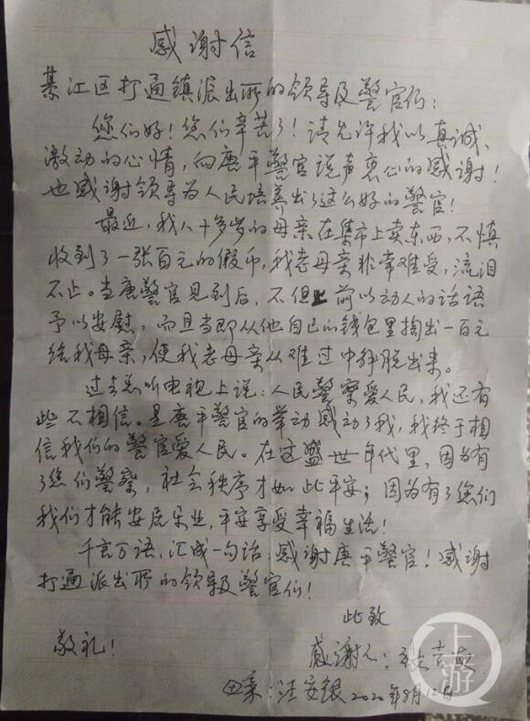 張先生看到母親回家后情緒有了變化,一打聽知道了民警做的好事,隨即寫來了感謝信。信中除了對(duì)唐頻表達(dá)感謝,還寫道:“在這盛世年代里,因?yàn)橛辛四銈兙,社?huì)秩序才如此平安;因?yàn)橛辛四銈儯覀儾拍馨簿訕窐I(yè),平安享受幸福生活!”