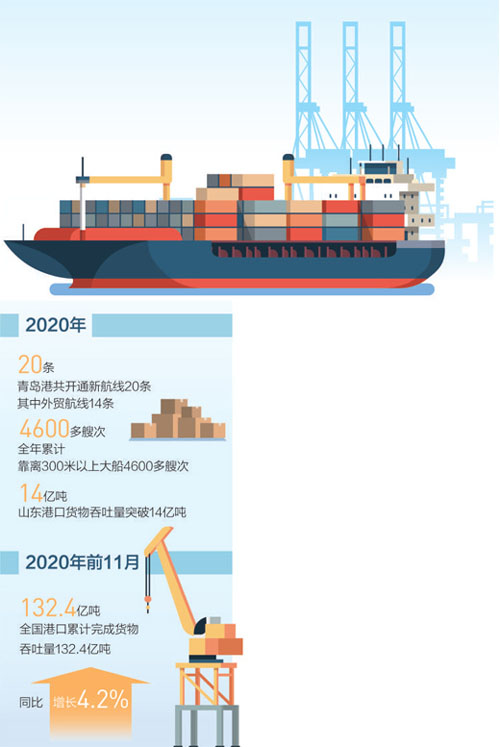 政策給力,更要發(fā)揮優(yōu)勢乘勢而上。在地理位置上,山東港口青島港是“一帶一路”上重要的節(jié)點(diǎn)城市、沿黃流域多省份的“出?凇保欣诮ㄔO(shè)東北亞航運(yùn)樞紐中心。2020年,山東港口青島港總共開通新航線20條,其中外貿(mào)航線14條。