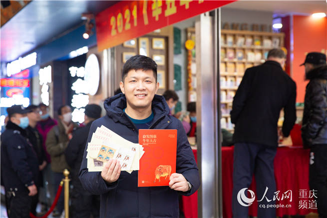 來(lái)自浙江的年輕情侶林峰和鄧麗,原本是到解放碑“打卡”游玩,偶然間在解放碑主題郵局看到生肖郵票發(fā)行活動(dòng),倆人也興奮地排起了長(zhǎng)隊(duì)!凹依锏母改敢恢倍加袨楹筝吺詹剜]冊(cè)、紀(jì)念幣的習(xí)慣。今天正好遇到這個(gè)活動(dòng),給家人買一份回去當(dāng)做新年禮物,表達(dá)一下我們晚輩的祝福!编圎愓f(shuō)道。