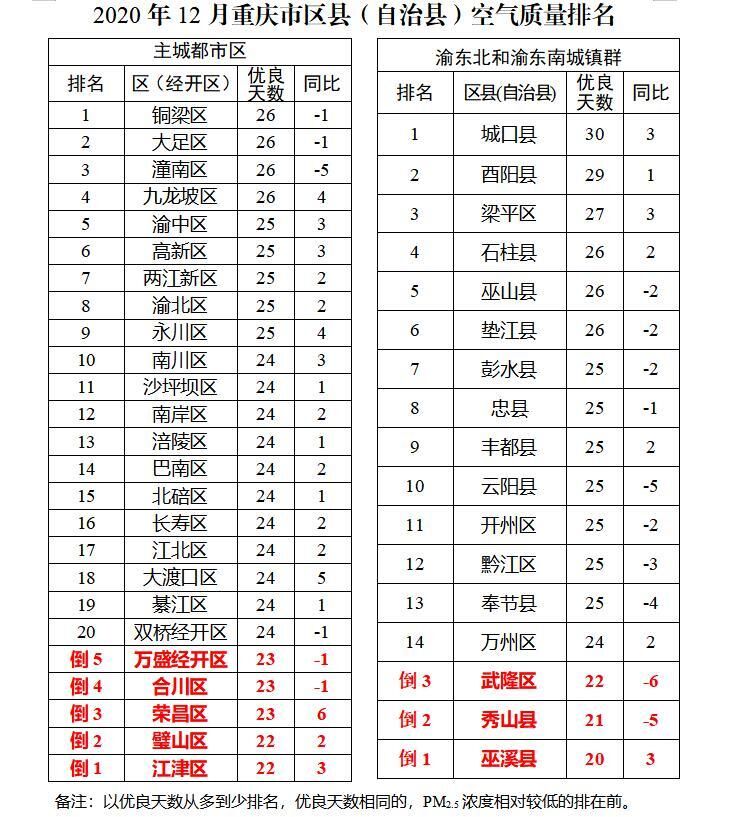 主城都市區(qū),12月,江津區(qū)、璧山區(qū)、榮昌區(qū)、合川區(qū)、萬盛經(jīng)開區(qū)空氣質(zhì)量相對較差(從倒數(shù)第1名至倒數(shù)第5名),銅梁區(qū)、大足區(qū)、潼南區(qū)、九龍坡區(qū)、渝中區(qū)空氣質(zhì)量相對較好(從第1名至第5名)。