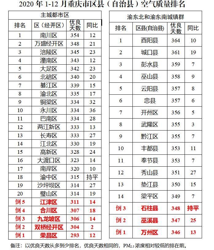 按照《重慶市大氣污染防治條例》第22條規(guī)定,今(6)日,重慶市生態(tài)環(huán)境局發(fā)布2020年12月和1-12月重慶市及區(qū)縣(自治縣)空氣質(zhì)量排名通報,去年重慶空氣質(zhì)量優(yōu)良天數(shù)為333天,再創(chuàng)新高,酉陽以364個優(yōu)良天數(shù),位列全市之首。