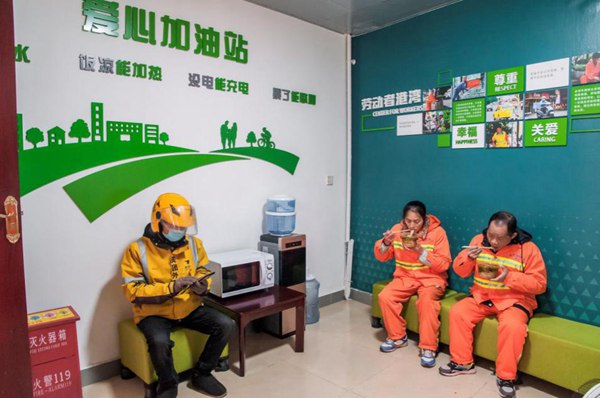 外賣小哥和環(huán)衛(wèi)工人在“勞動(dòng)者港灣”休息用餐。 重慶市城市管理局供圖